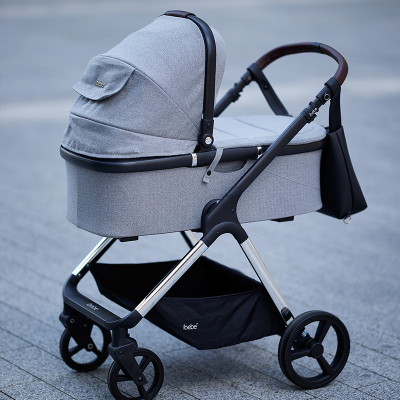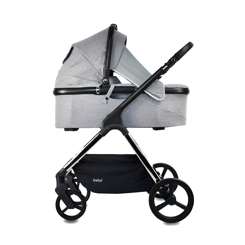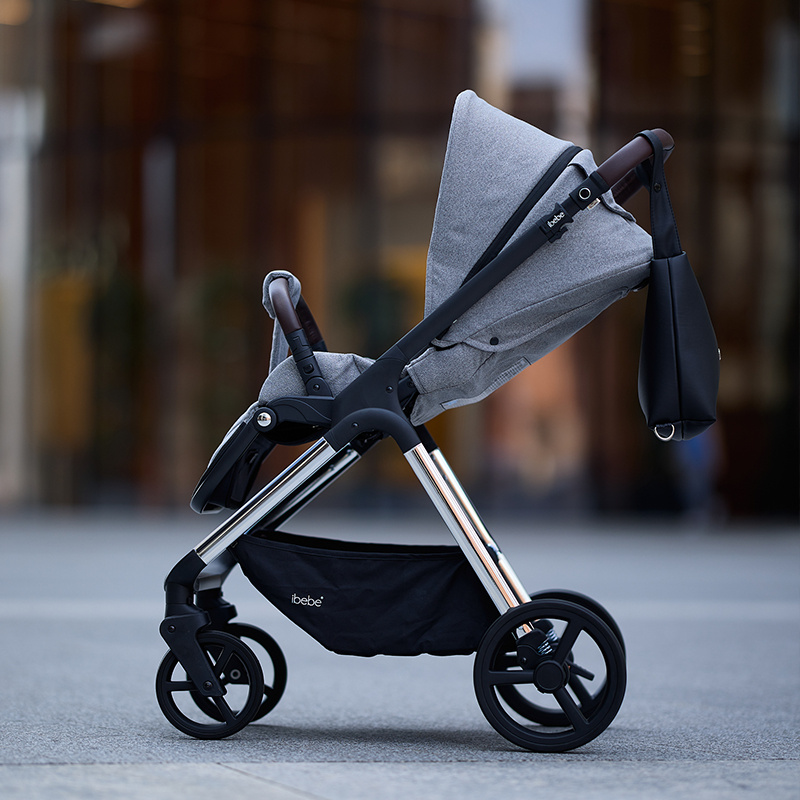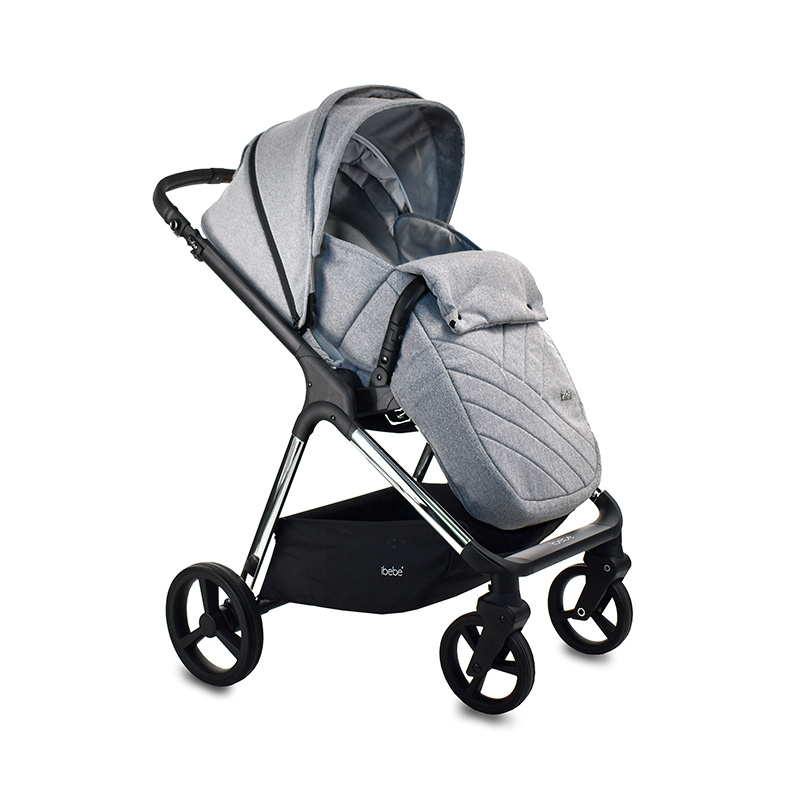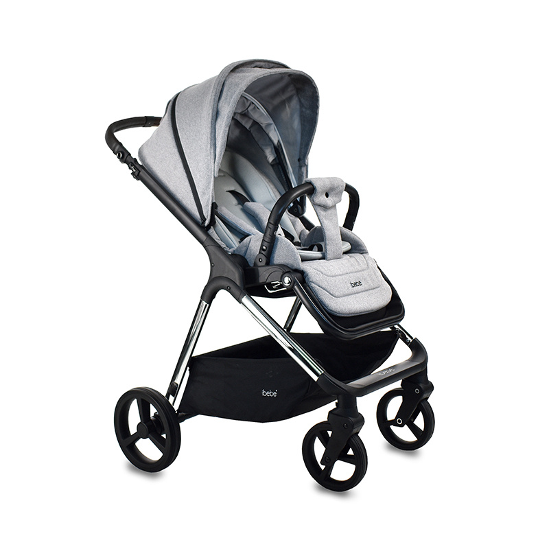 Nowoczesny i elegancki wózek dziecięcy dla noworodka ibebe ICE. Wózek ibebe Ice występuję w kilku kolorach tapicerek oraz w 3 kolorach stelaża: złoty, srebrny chromowany oraz czarny. Każdy rodzić może dopasować odpowiedni kolor do swojego stylu. iBebe ICE sprawdzi się w każdym terenie, wszystkie koła są bezobsługowe, amortyzacja jest miękka. Przednie koła są skrętne z możliwością  blokady do jazdy na wprost. Wysokość raczki jest regulowana. W wózku ibebe Ice jest możliwość wpięcia gondoli, spacerówki i fotelika samochodowego przodem lub tyłem do kierunku jazdy.
