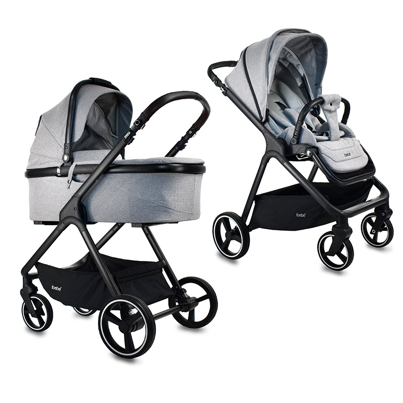 Nowoczesny i elegancki wózek dziecięcy dla noworodka ibebe ICE. Wózek ibebe Ice występuję w kilku kolorach tapicerek oraz w 3 kolorach stelaża: złoty, srebrny chromowany oraz czarny. Każdy rodzić może dopasować odpowiedni kolor do swojego stylu. iBebe ICE sprawdzi się w każdym terenie, wszystkie koła są bezobsługowe, amortyzacja jest miękka. Przednie koła są skrętne z możliwością blokady do jazdy na wprost. Wysokość raczki jest regulowana. W wózku ibebe Ice jest możliwość wpięcia gondoli, spacerówki i fotelika samochodowego przodem lub tyłem do kierunku jazdy.