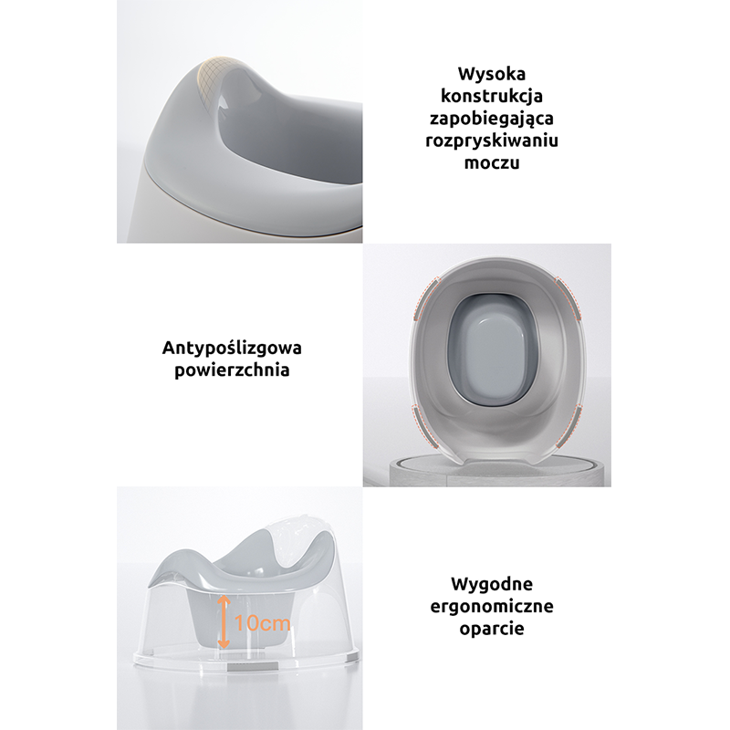 Ines&John nocnik dziecięcy z wyjmowana wkładką. Łatwy w użyciu i funkcjonalny produkt, ułatwiający naukę korzystania z toalety. Ergonomiczna konstrukcja zapewnia dziecku komfort a solidne wykończenie z antypoślizgową podstawą bezpieczeństwo. Wyjmowana wkładka  o wysokości 10cm zapewnia szybkie i skuteczne opróżnianie. Ergonomiczne oparcie wspiera ułożenie pleców, jednocześnie nie ograniczając ruchów dziecka. Wysoka przednia część wkładki zabezpiecza podłogę przed rozbryzgami.