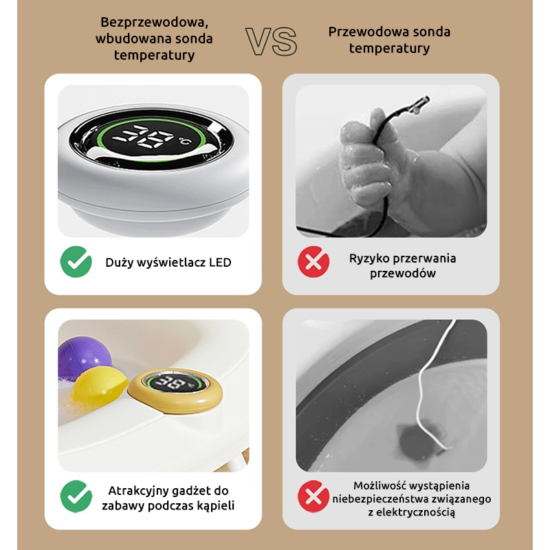 Wyjmowany magnetyczny termometr ułatwia rodzicom stałą kontrolę temperatury wody. Wyświetla 3 poziomy temperatury: za niską, za wysoką i odpowiednią, zapewniając dziecku komfortową kąpiel za każdym razem. Termometr jest wodoszczelny i może pełnić funkcję zabawki bez obawy o zalanie.