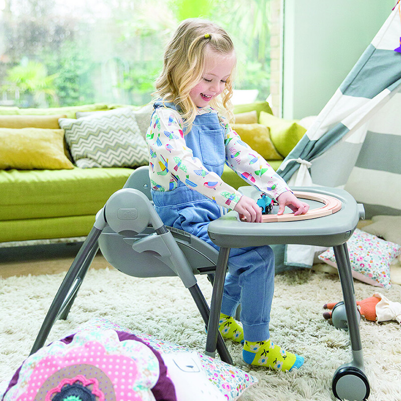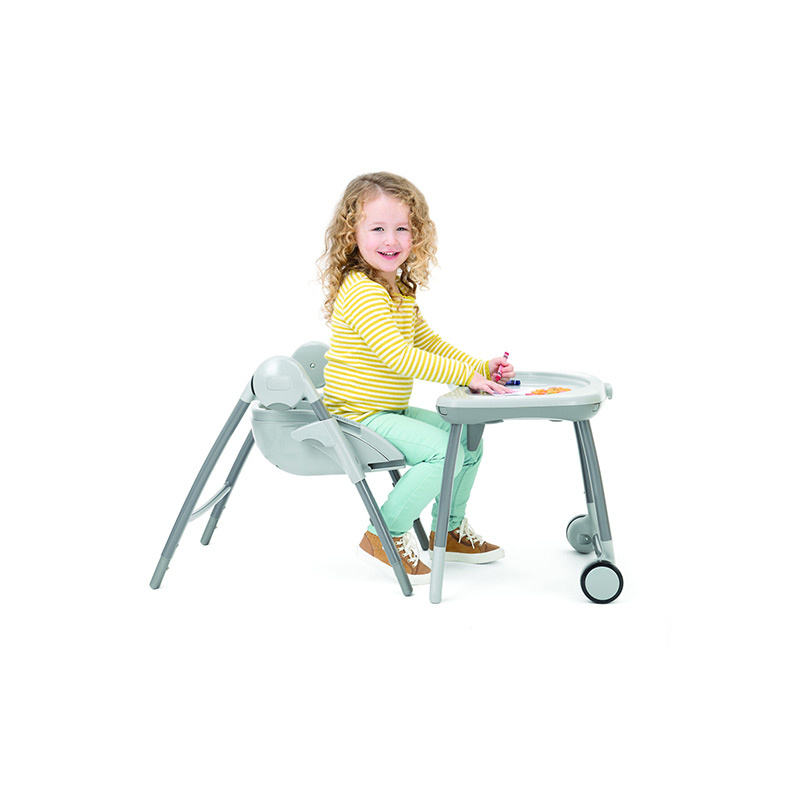 W zależności od potrzeby możemy używać całego wysokiego krzesełka, samego siedziska jako nakładki na krzesło lub dwuczęściowego zestawu mobilnego krzesła i stolika do zabawy.