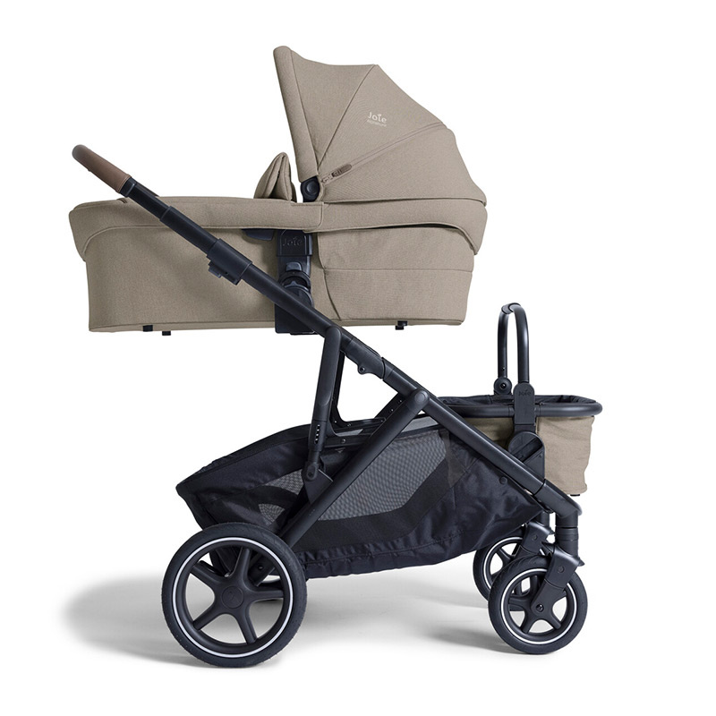 W zestawie z wózkiem Joie Versiti znajduje się dodatkowy przenośny koszyk do zamontowania na stelażu wózka, folia przeciwdeszczowa oraz adaptery do zamontowania fotelika/gondoli.
