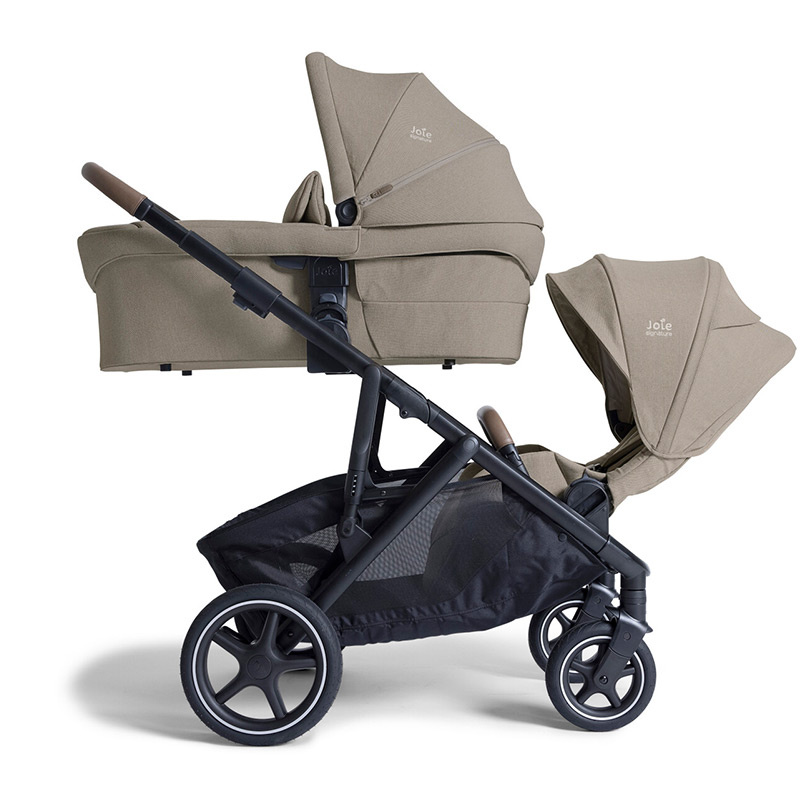 Joie Versiti, wszechstronny wózek 2w1 rok po roku dla dwójki dzieci z wieloma możliwościami konfiguracji. W zestawie znajdują się: wózek spacerowy, dodatkowe siedzisko oraz dwie gondole. Przeznaczony jest dla dzieci od urodzenia do maksymalnej wagi 22 kg. Stelaż składa się na płasko wraz z wpiętym siedziskiem spacerowym zarówno przodem, jak i tyłem do kierunku jazdy. Wózek posiada wysokiej jakości gumowe koła wypełnione pianką z technologią PunctureProof, zapobiegającą przebiciu. Przednie koła są skrętne z możliwością zablokowania do jazdy na wprost, dzięki czemu pokonywanie przeszkód na spacerze jest niezwykle proste. Amortyzacja na każde koło z osobna gwarantuje płynną jazdę na każdym terenie. Dodatkowa amortyzacja stelaża jeszcze bardziej podnosi komfort dziecka na spacerze. Duży koszyk na zakupy w stelażu pomieści wszystkie niezbędne na spacerze akcesoria. Rączka pokryta ekoskórą ma możliwość teleskopowej regulacji wysokości w zależności od potrzeb. Hamulec typu ShoeSaver umieszczony przy prawym kole działa szybko na zasadzie jednego naciśnięcia. Wypinany obustronnie pałąk zapewnia dziecku bezpieczeństwo.