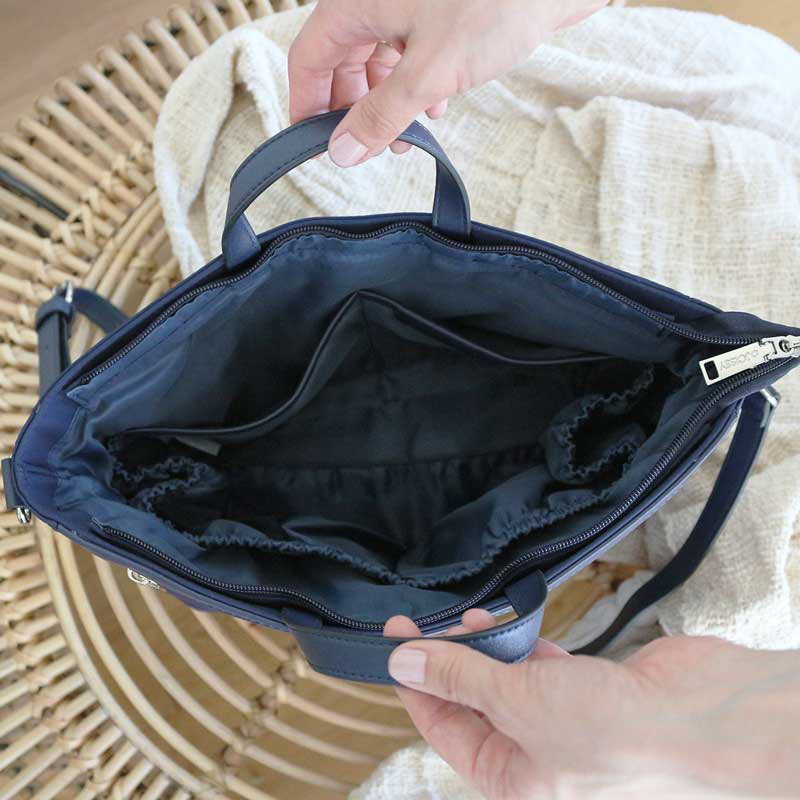 Organizer jest zamykany jest zamkiem błyskawicznym. Posiada 9 kieszeni, w tym aż 5 wewnątrz oraz miejsce na butelkę lub kubek. Poszerzone dno zapewnia większą pojemność, dzięki czemu bez trudu pomieści wszystkie niezbędne akcesoria. Praktyczne kieszenie ułatwiają organizację, przednia kieszonka pomieści smartfon, a zapinana na zamek bezpiecznie przechowa dokumenty lub portfel. Dzięki uniwersalnym zaczepom organizer można wygodnie przymocować do wózka lub nosić na długim pasku jako stylową torebkę listonoszkę.