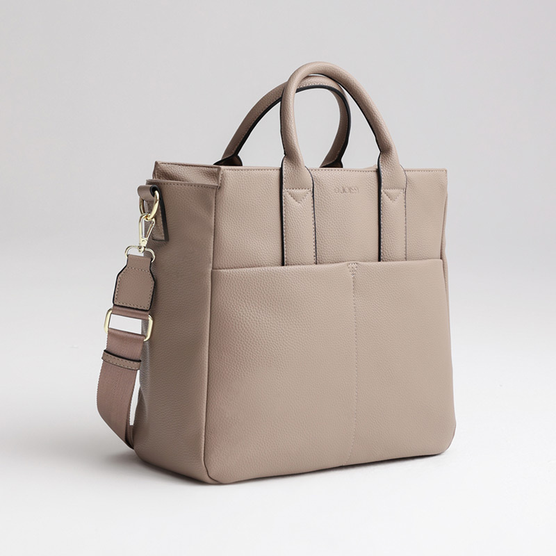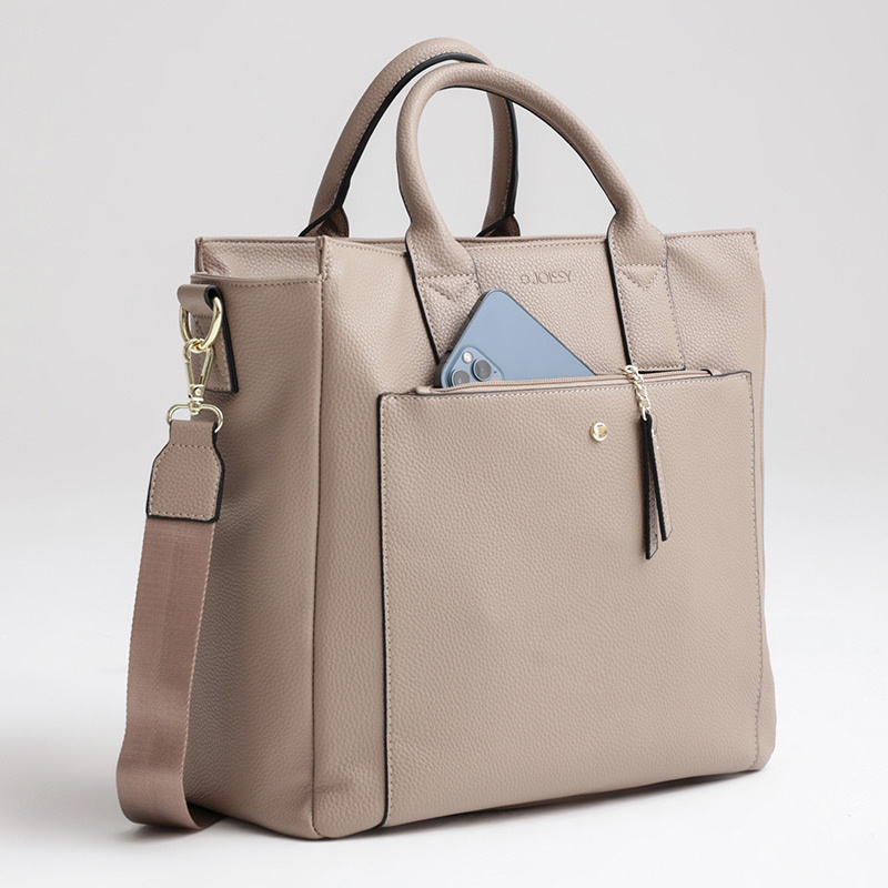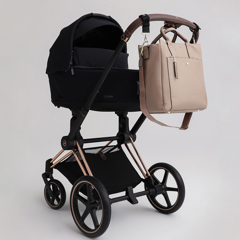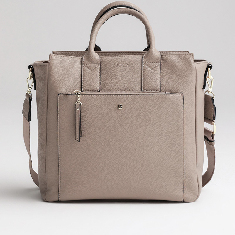 Joissy Gina, klasyczna i elegancka torba dla mamy. Dzięki regulowanemu paskowi można nosić klasycznie ją na ramieniu lub odpiąć pasek i trzymać w ręce. Jest też możliwość zawieszenia torby na rączce niemal każdego wózka dzięki regulowanym zaczepom.