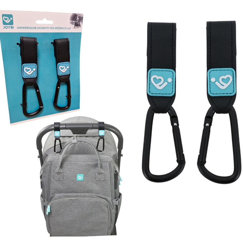 Joybi Uniwersalne uchwyty do wózka. Mocowane są na rączce wózka za pomocą pasków z rzepem. Zakończone są karabińczykiem, na którym można zawiesić zakupy, plecak lub torbę pielęgnacyjną. Na uchwytach można umieścić przedmioty o maksymalnej wadze do 10 kg.
