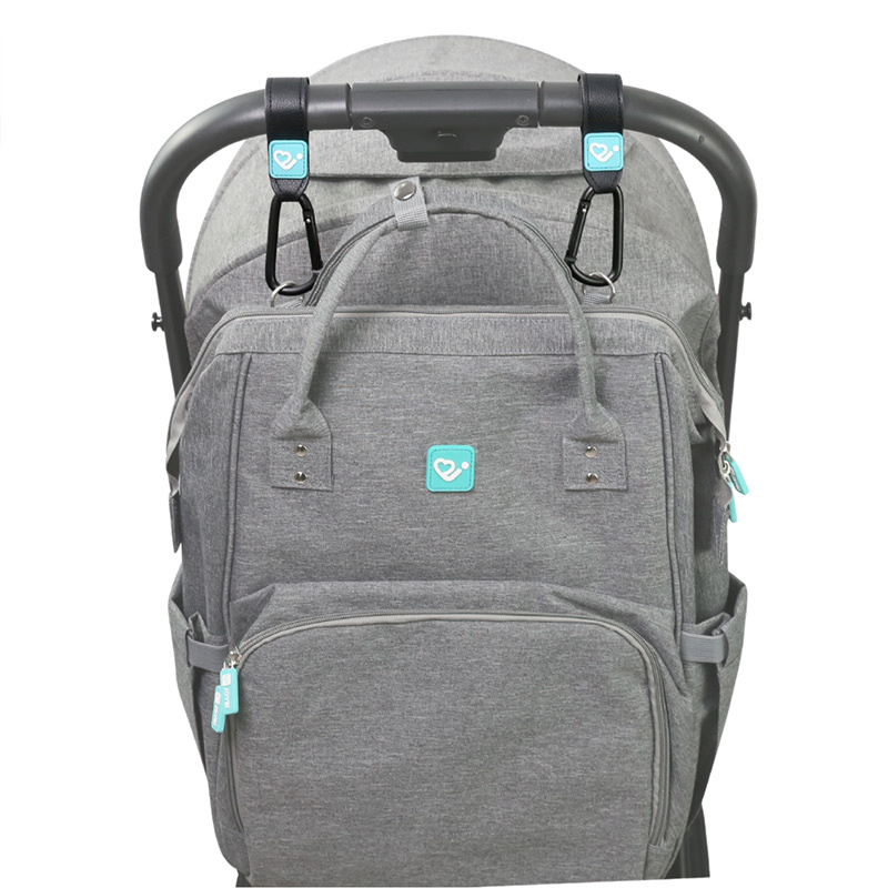 - Uniwersalne uchwyty do zaczepienia torby lub plecaka na rączce wózka.