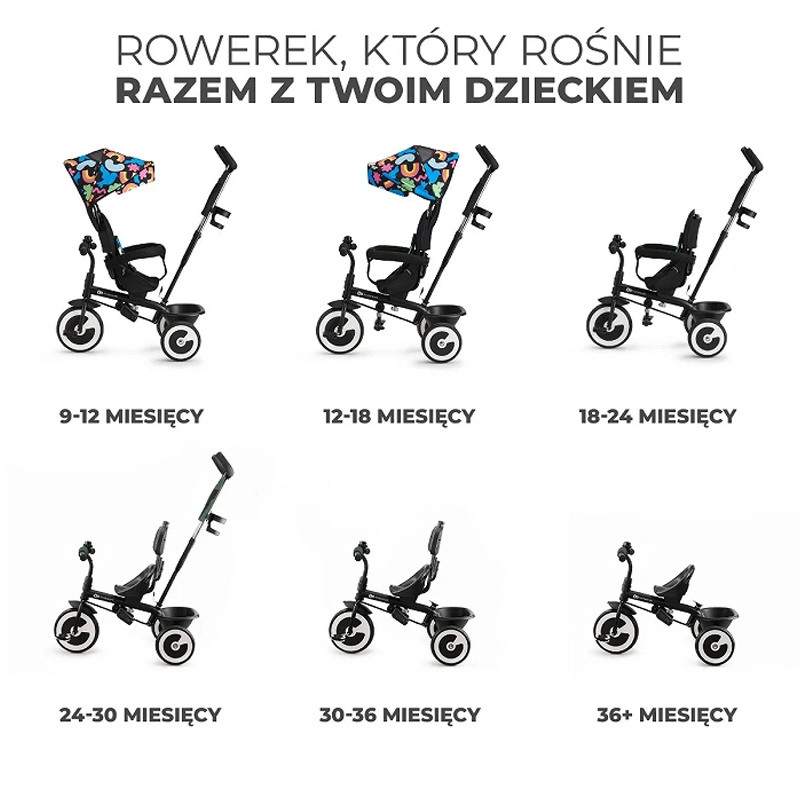 Kinderkraft rowerek trójkołowy Aston. Przeznaczony już od 9 miesiąca życia, dający wiele możliwości dzieciom i rodzicom. W pierwszych etapach używania rodzic będzie mógł kontrolować kierunek i prędkość jazdy dziecka na spacerze dzięki dołączonej kierownicy. Aby zapewnić dziecku pełnię bezpieczeństwa siedzisko z barierką można obrócić tyłem do kierunku jazdy i przypiąć dziecko wewnętrznymi pasami. Od około 12 miesiąca można obrócić siedzisko przodem i korzystać z pełni możliwości rowerka Aston. Kierownica została zaprojektowana w taki sposób, by ułatwić pierwsze próby prowadzenia. Antypoślizgowe rączki zapewnią pewny chwyt, a dzwonek z pewnością umili maluchowi naukę. Składane nóżki będą odpowiednie do momentu aż dziecko urośnie lub w momencie odpoczynku. Przednie koło z pedałami można dostosować do aktualnych umiejętności dziecka. Może działać w klasyczny sposób lub niezależnie, bez napędzania w funkcji wolnego koła. Rozkładany daszek ochroni przed słońcem deszczem lub wiatrem. Można ją z razie potrzeby złożyć lub zdemontować. Wygodny hamulec znajduje się na tylnej osi.