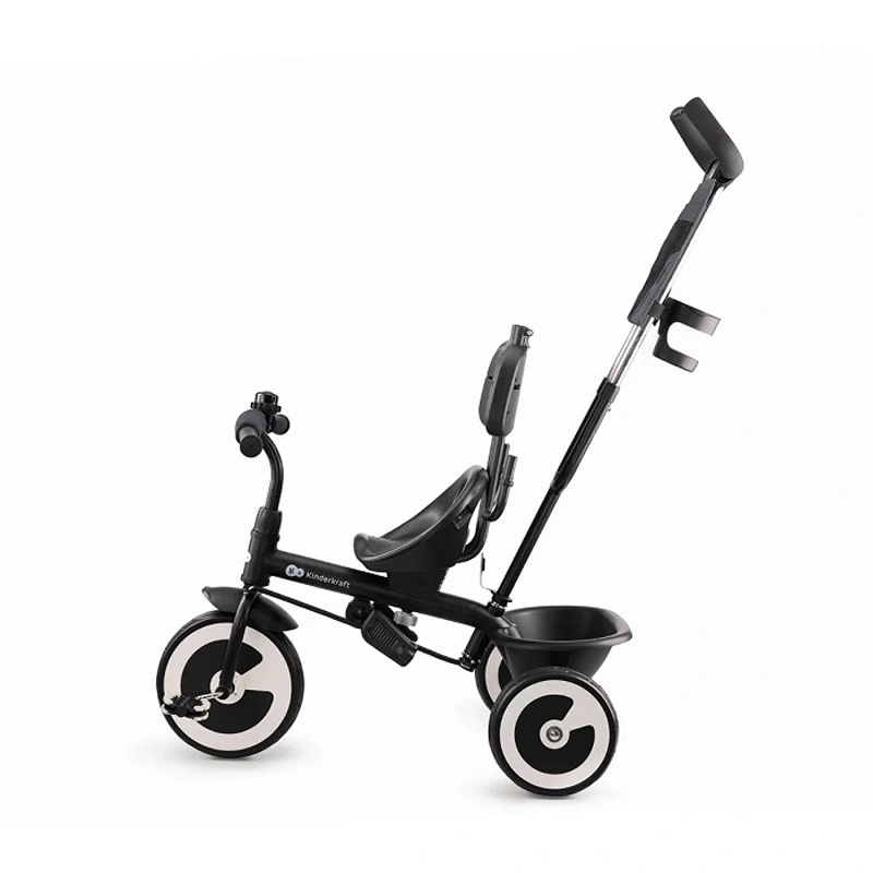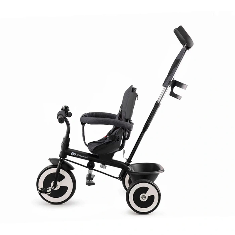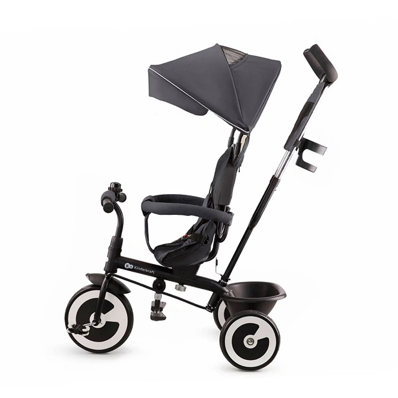 Kinderkraft rowerek trójkołowy Aston. Przeznaczony już od 9 miesiąca życia, dający wiele możliwości dzieciom i rodzicom. W pierwszych etapach używania rodzic będzie mógł kontrolować kierunek i prędkość jazdy dziecka na spacerze dzięki dołączonej kierownicy. Aby zapewnić dziecku pełnię bezpieczeństwa siedzisko z barierką można obrócić tyłem do kierunku jazdy i przypiąć dziecko wewnętrznymi pasami. Od około 12 miesiąca można obrócić siedzisko przodem i korzystać z pełni możliwości rowerka Aston. Kierownica została zaprojektowana w taki sposób, by ułatwić pierwsze próby prowadzenia. Antypoślizgowe rączki zapewnią pewny chwyt, a dzwonek z pewnością umili maluchowi naukę. Składane nóżki będą odpowiednie do momentu aż dziecko urośnie lub w momencie odpoczynku. Przednie koło z pedałami można dostosować do aktualnych umiejętności dziecka. Może działać w klasyczny sposób lub niezależnie, bez napędzania w funkcji wolnego koła. Rozkładany daszek ochroni przed słońcem deszczem lub wiatrem. Można ją z razie potrzeby złożyć lub zdemontować. Wygodny hamulec znajduje się na tylnej osi.