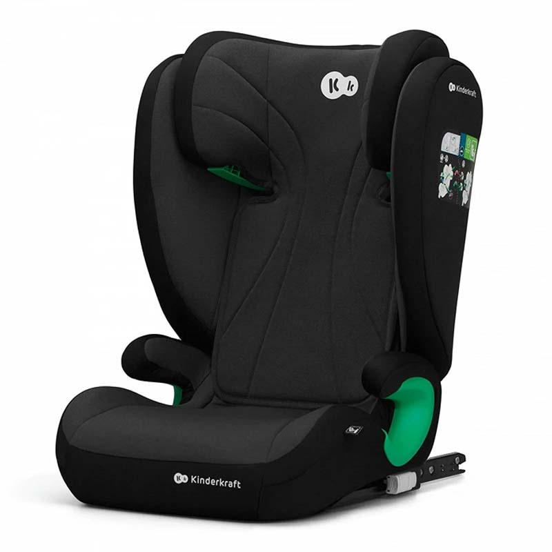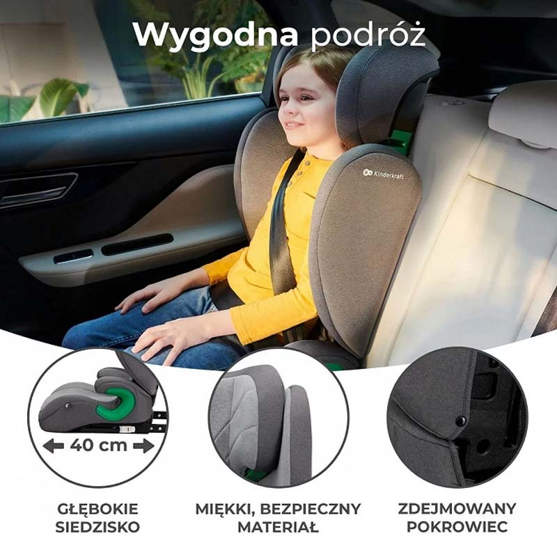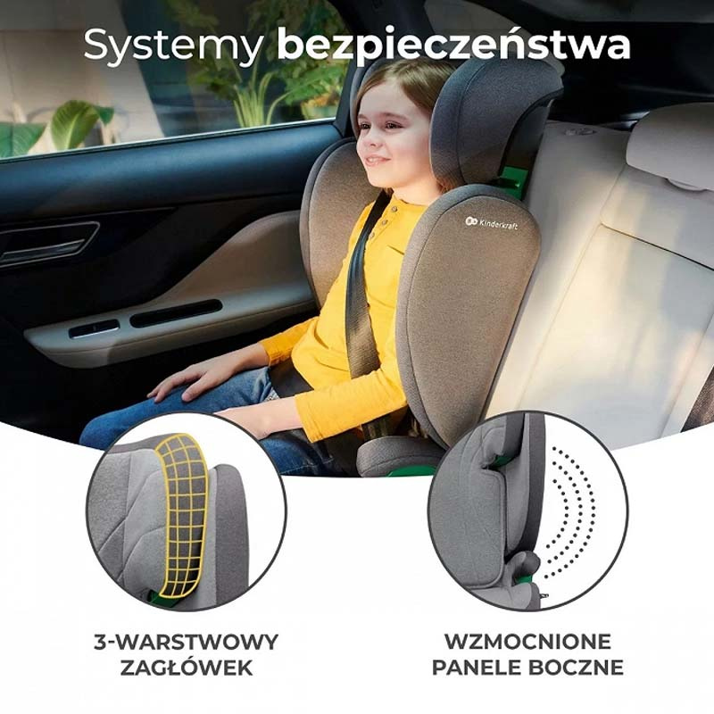 Fotelik Kinderkraft Junior Fix 2 i-Size przeznaczony jest dla dzieci od około 100 do 150 cm wzrostu. Mocowany jest w samochodzie za pomocą pasa samochodowego i systemu isofix lub samym pasem samochodowym. Specjalne wskaźniki pokażą, czy fotel został prawidłowo zamocowany do samochodu. Oparcie w foteliku jest odchylane, by jak najlepiej dopasować się do kanapy w samochodzie. Wyposażono go w dedykowane systemy bezpieczeństwa - SIDE Protect System, czyli wzmocnione osłony boczne, absorbują energię, wytworzoną podczas zderzenia. Dobrze chronią wrażliwy kręgosłup i ramiona dziecka. Zagłówek w technologii H-Guard jest szeroki, głęboki i dobrze dopasowany do głowy dziecka. Sprawdzi się idealnie w czasie drzemki. Dodatkowo jego wnętrze jest wzmocnione, wykonane z 3 warstw pianki memory, co doskonale chroni w przypadku zderzeń, pochłaniając energię i nie dopuszczając, aby dotarła ona do głowy dziecka. Zagłówek posiada 10-cio stopniową regulację jedną reki, możemy dopasować go do wzrostu dziecka. Fotelik Kinderkraft Junior Fix 2 i-Size jest zgodny z najnowszą norma i-Size.