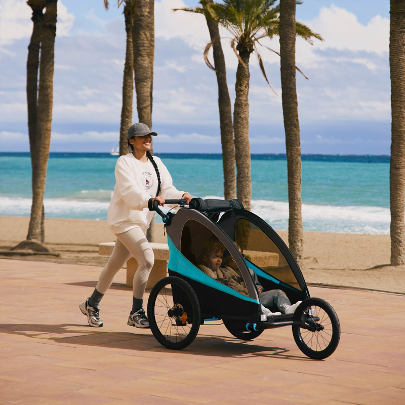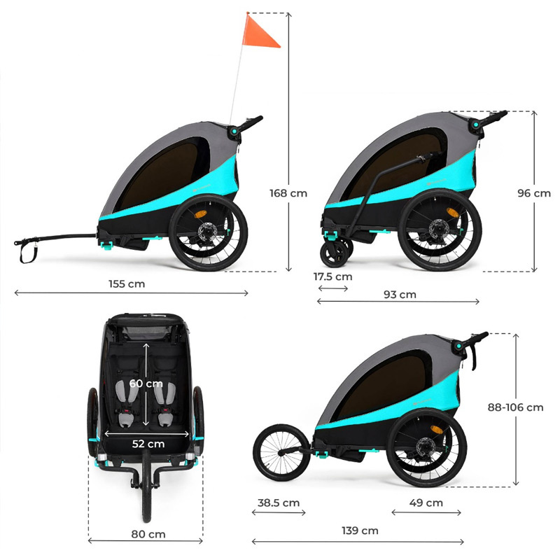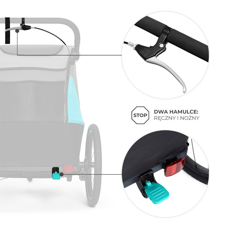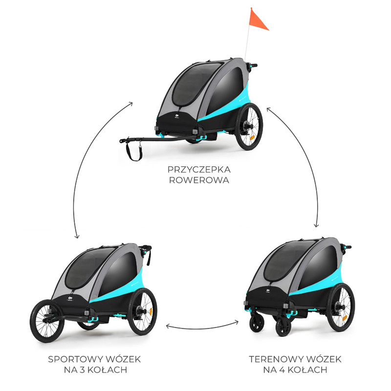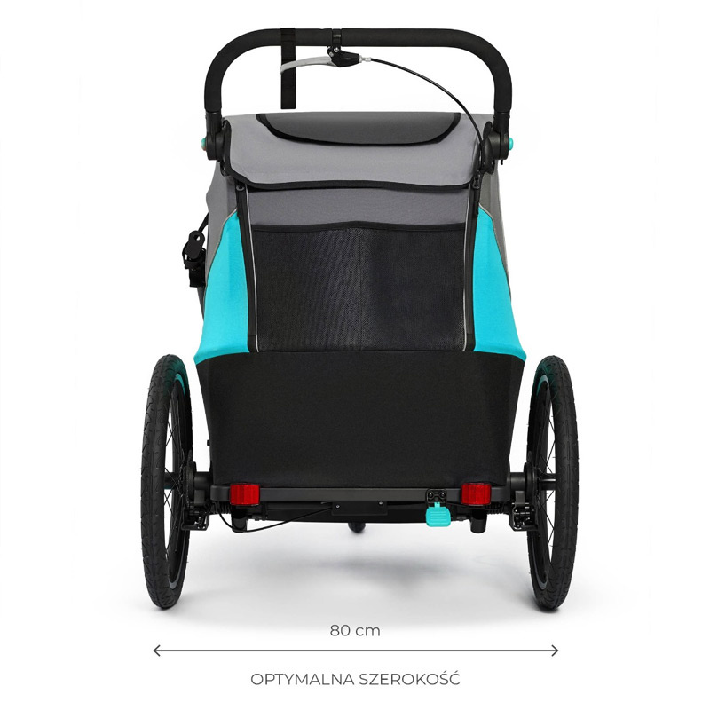 Wielofunkcyjna przyczepka rowerowa 3w1, Kinderkraft Nava Z łatwością może sprostać potrzebom aktywnych rodziców w przypadku jednego lub dwójki dzieci. Dzięki modułowej konstrukcji pełni rolę przyczepki rowerowej, wózka spacerowego i biegowego, a sam montaż i znana trybu jazdy jest szybka i łatwa. Kinderkraft Nava przeznaczona jest dla dzieci do maksymalnej łącznej wagi 42,5 kg, a maksymalne obciążenia wraz z bagażami to aż 60 kg. Solidny stelaż waży składa się szybko i łatwo na płasko. Tylne koła są zdejmowane, dzięki czemu Kinderkraft Nava jest łatwy w przechowywaniu. Tylna amortyzacja i pompowane koła ułatwiają prowadzenie na niemal każdej powierzchni. Przednie, skrętne koła ułatwiają manewrowanie. Duże przednie koło dla wózka biegowego gwarantuje stabilność prowadzenia. Wygodne siedziska z pięciopunktowymi pasami zapewniają dziecku najwyższy komfort w trakcie podróży. Wygodne schowki wewnątrz i na zewnątrz z łatwością pomieszczą niezbędne przekąski i zabawki. Zintegrowana moskitiera, osłona przeciwdeszczowa i przeciwsłoneczna są odpowiednie na każde warunki. Ergonomicznie wyprofilowana rączka z regulacją wysokości w 15 pozycjach pozwala na bardzo wygodne prowadzenie wózka jedna ręką i dostosowanie do wzrostu opiekuna. Hamulec znajduje się na tylnej osi po prawej stronie i jest łatwy w użyciu.