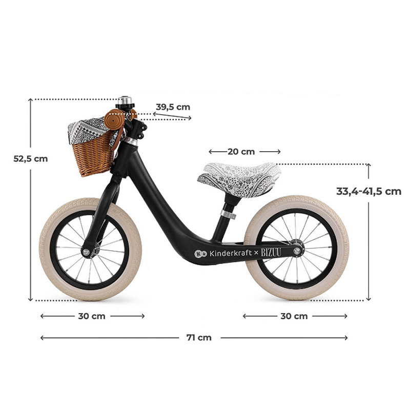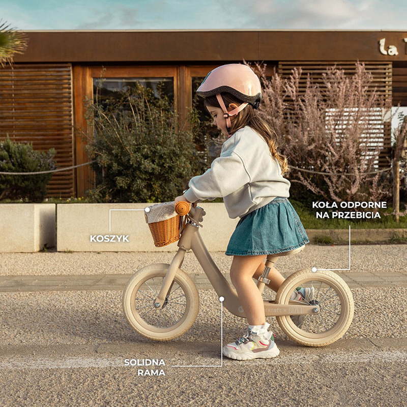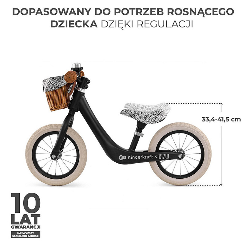 Kinderkraft rowerek biegowy Rapid 2 w wersji limitowanej z marką Bizuu. Wysokiej jakości tkaniny oraz unikalny styl nadadzą całości elegancji i szyku. Najlepszy sposób na przygotowanie dziecka do nauki jazdy na rowerze. Jest niezwykle lekki,waży tylko 3,7kg a rama ze stopu magnezu, wykonana z jednego odlewu jest niezwykle wytrzymała i estetyczna. Rapid 2 wyposażony jest w duże, odporne na przebicia koła, które poradzą sobie w każdym terenie. Ergonomiczna siodełko można regulować w zakresie 33-42 cm i dostosować do aktualnego wzrostu dziecka. Zgodnie z normami bezpieczeństwa kierownica ma ograniczony zakres ruchu, co chroni dziecko przed upadkiem podczas skręcania. Kierownica nie wyślizgnie się z rąk dziecka dzięki gumowym rączkom.