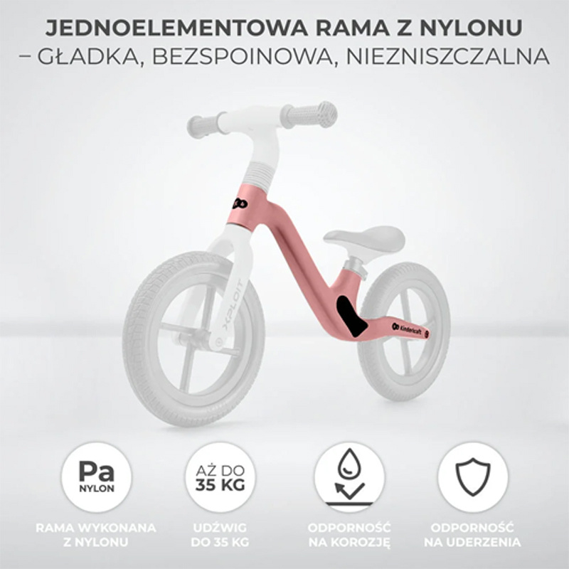 Kinderkraft rowerek biegowy Xploit. Najlepszy sposób na przygotowanie dziecka do nauki jazdy na rowerze i utrzymywania równowagi. Przeznaczony jest dla dzieci nawet od 80 cm wzrostu. Jest niezwykle lekki, nylonowa rama z pojedynczego odlewu waży zaledwie 1kg. Rowerek Xpoit wyposażony jest w duże, odporne na przebicia koła, które poradzą sobie w każdym terenie. Oba koła są łożyskowane dzięki czemu zapewnią płynną i bezpieczną jazdę. Ergonomiczna siodełko można regulować w zakresie 33-38 cm i dostosować do aktualnego wzrostu dziecka. Kierownica też jest regulowana w zakresie 53,6 - 55,6 cm. Sama nie wyślizgnie się z rąk dziecka dzięki gumowym rączkom. Praktyczny podnóżek zamykany magnetycznie zapewni stopom podparcie w trakcie zjeżdżania z górki.
