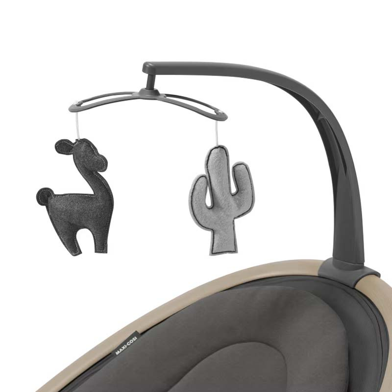 Huśtawka Maxi Cosi Cassia działa poprzez podłączenie do sieci lub za pomocą wbudowanego akumulatorka.