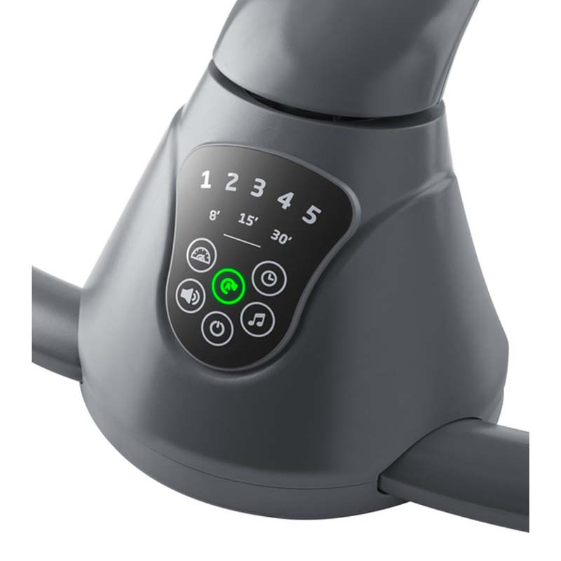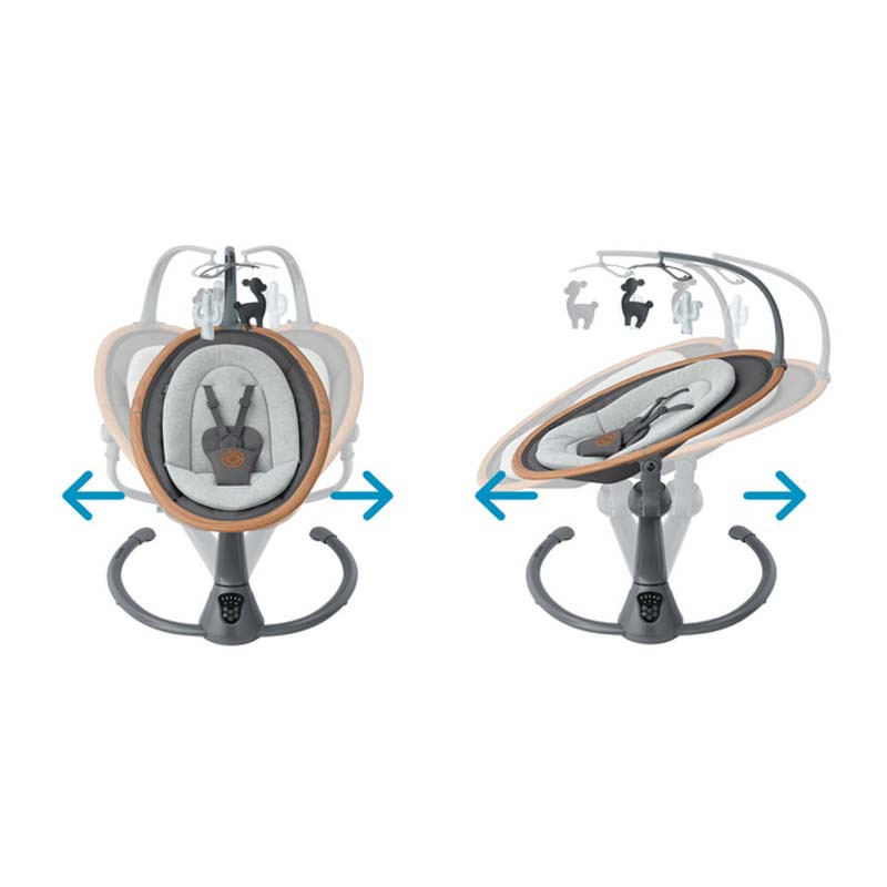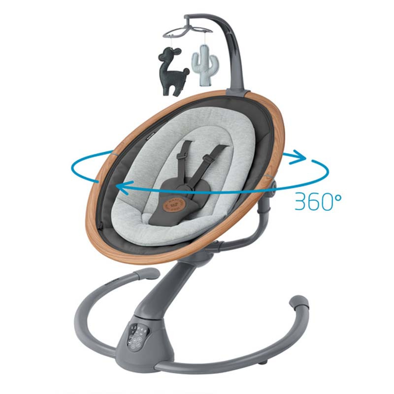 Cassia wyposażona jest w miękką wkładkę i 3-punktową uprząż, dzięki czemu dziecko bezpiecznie i komfortowo utrzymuje się na miejscu. Dwie pozycje odchylenia oparcia pozwolą dostosować się do potrzeb dziecka. Huśtawka posiada 5 prędkości kołysania i 12 łagodnych dźwięków natury i melodii, co pozwoli uspokoić dziecko. Automatyczne wykrywanie ruchu dziecka rozpoczyna kołysanie w momencie gdy dziecko staje się niespokojne. Wszystkie te funkcje są dostępne na intuicyjnym panelu sterowania z ekranem dotykowym. Funkcja pełnego obrotu 360º pozwoli rodzicom na wygodną obserwację dziecka w trakcie wykonywania prac domowych lub odpoczynku.