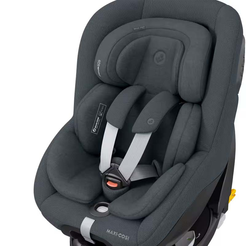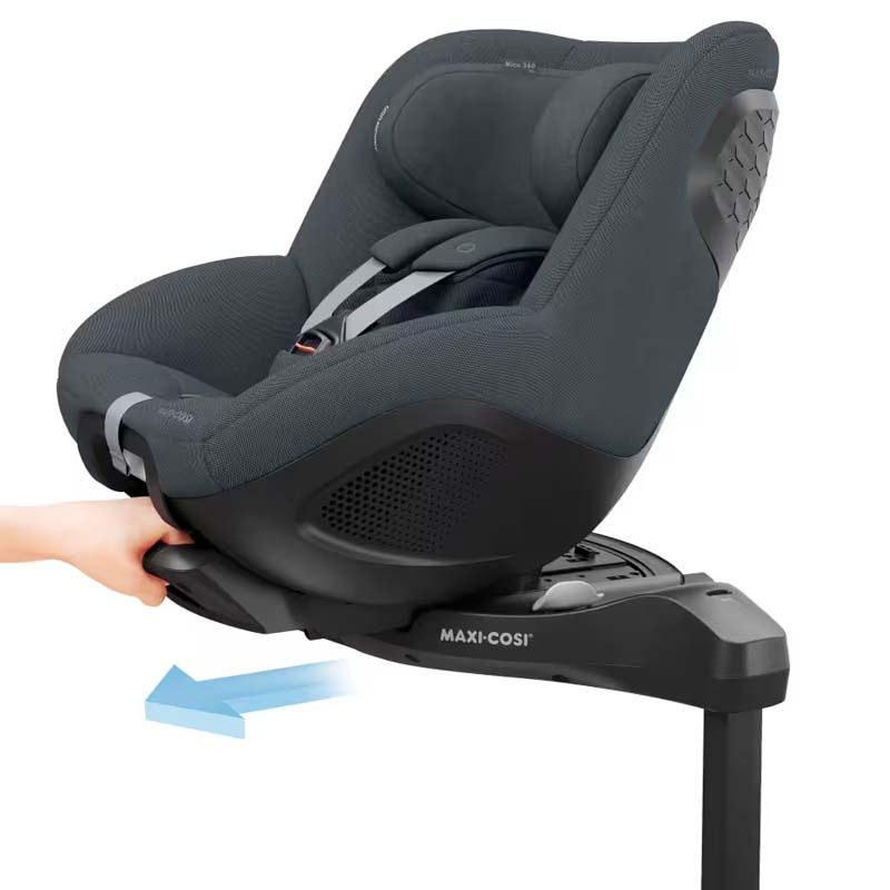 Fotelik samochodowy Maxi Cosi Mica 360 Pro. Przeznaczony jest dla dziecka od urodzenia do 105 cm wzrostu i maksymalnie 18 kg wagi. Montowany jest na zintegrowanej bazie za pomocą systemu isofix i nogi wspierającej z możliwością pełnego obrotu 360º. Prosty mechanizm FlexiSpin pozwala obrócić bazę jedną ręką, co ułatwia posadzenie dziecka w foteliku oraz prawidłowe zapięcie pasów. Rewolucyjna technologia dodatkowego wysuwania fotela na bazie SlideTech zapewnia łatwe i szybkie włożenie i wyjęcie dziecka z fotelika bez szarpania i bólu placów. Mica 360 Pro daje dziecku możliwość podróżowania tyłem do kierunku jazdy przez cały okres użytkowania lub przodem powyżej 76 cm wzrostu. Specjalna blokada uniemożliwia zbyt wczesne obrócenie fotela przodem, zapewniając tym samym maksimum bezpieczeństwa dla dziecka. Maxi Cosi Mica 360 Pro jest bardzo dobrze dostosowany do potrzeb niemowlaka. Siedzisko zostało wyposażone w odpowiednią wkładkę wypłycająca dla noworodków. Oparcie odchyla się tak, aby zapewnić malutkiemu dziecku maksymalnie płaską pozycję. Oparcie regulowane jest w 5 pozycjach zarówno przodem, jak i tyłem do kierunku jazdy. Uprząż wewnętrzna z 5-punktowymi pasami została wyposażona w system easy-in, dzięki któremu odstaja od oparcia fotelika i łatwiej umieścić dziecko w siedzisku. Zagłówek regulowany jest razem z pasami w 9 pozycjach, dostosowuje się do wzrostu dziecka.