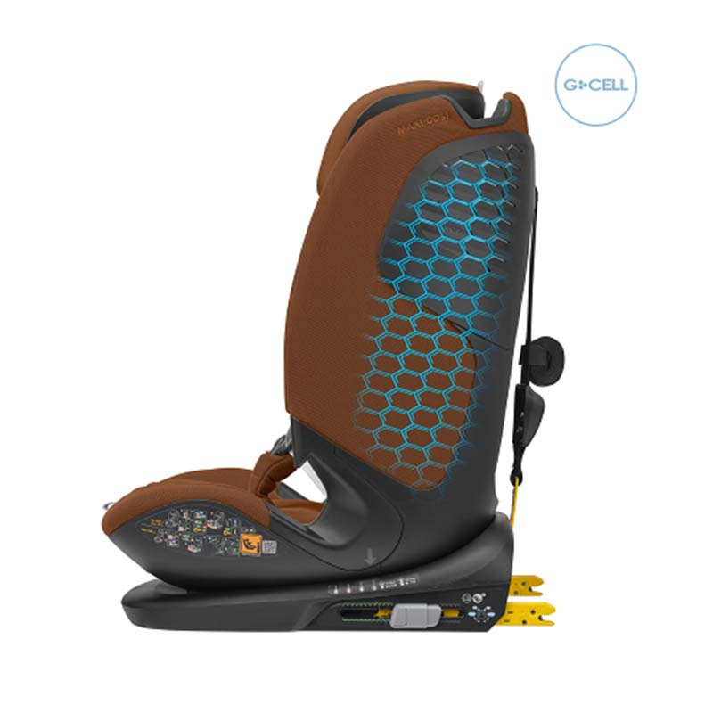 Fotelik samochodowy Titan Pro2 i-Size wystarczy na długo od około roku do 12. lat (76 - 150 cm; 12-36 kg). Przez cały okres użytkowania mocowany jest przodem do kierunku jazdy za pomocą zaczepów Isofix oraz pasa TOP Tether jako trzeci punkt mocujący. Gdy dziecko przekroczy 105 cm wzrostu wewnętrzne pasy można łatwo odczepić i dziecko zapinane jest w foteliku za pomocą pasa samochodowego. Fotelik Titan Pro2 i-Size ma możliwość odchylenia oparcia w czterech pozycjach, dzięki temu młodsze dziecko ma możliwość komfortowej drzemki podczas podróży. Pięciopunktowe wewnętrzne pasy zostały wyposażone w miękkie nakładki. Zagłówek regulowany jest aż w 15. pozycjach, dzięki czemu łatwo zawsze jest odpowiednio dopasowany do wzrostu dziecka. Fotel posiada dodatkową wkładką barkową zapewniającą komfort mniejszemu dziecku. Rozbudowany system wentylacji ClimaFlow zapewnia lepszą cyrkulację powietrza i dziecko mniej się poci podczas jazdy w foteliku. O bezpieczeństwo dziecka dba trzypunktowy, stabilny system mocowania, rozbudowana ochrona boczna fotelika C-Gell 2.0 ma za zadanie absorbować skierowane z różnych stron siły działające na fotelik. Zagłówek został wyposażony dodatkowe poduszki bezpieczeństwa Air Protect, które pochłaniają energię działająca na głowę i szyję dziecka, ale także poprawiają komfort i wygodę podczas podróży w foteliku Maxi Cosi Titan Pro2 i-Size.