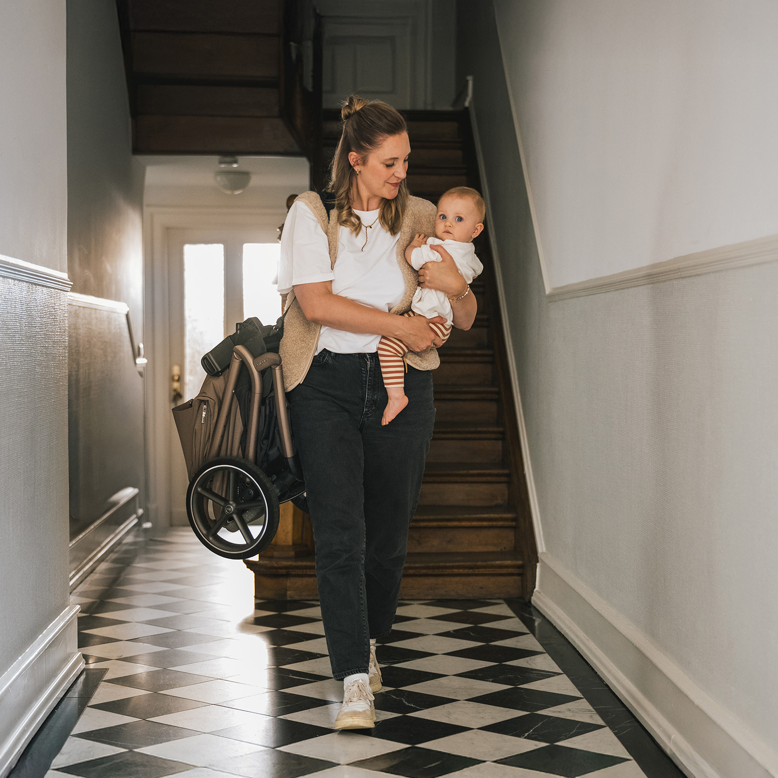 Stelaż z kołami waży 7 kg, a cały wózek z gondolą 11 kg. Składanie jedną ręką działa również z wpiętym siedziskiem spacerowym, a kompaktowe wymiary po złożeniu ułatwiają przewożenie w aucie i przechowywanie w domu. Opony SoftGlide™ oraz przednie i tylne zawieszenie mają wspierać płynne prowadzenie na co dzień, a blokowane przednie koła pomagają zwiększyć stabilność na nierównym podłożu. Teleskopową rączkę można ustawić na pięciu poziomach.