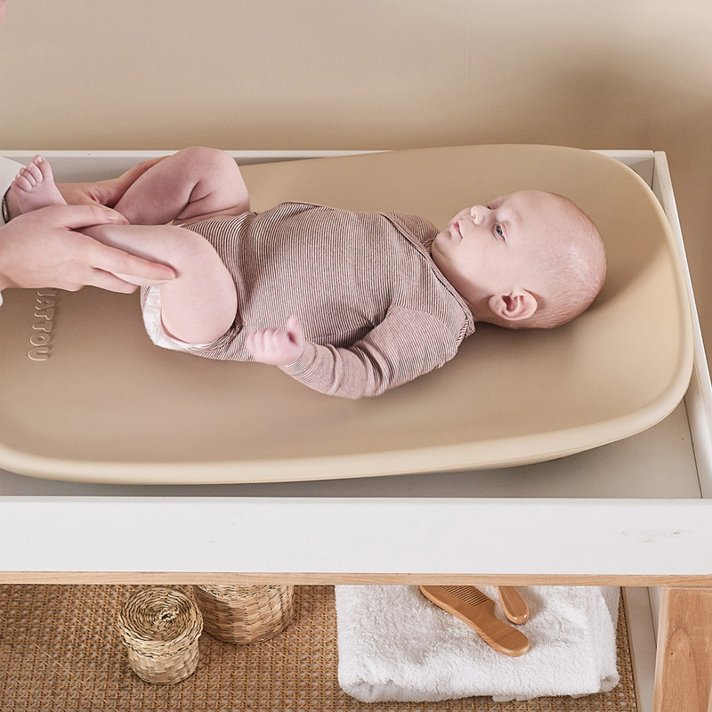 Stylowa mata do przewijania Nattou Softy PU bez BPA 50x70 cm w kolorze beżowym na komodzie w pokoju dziecka