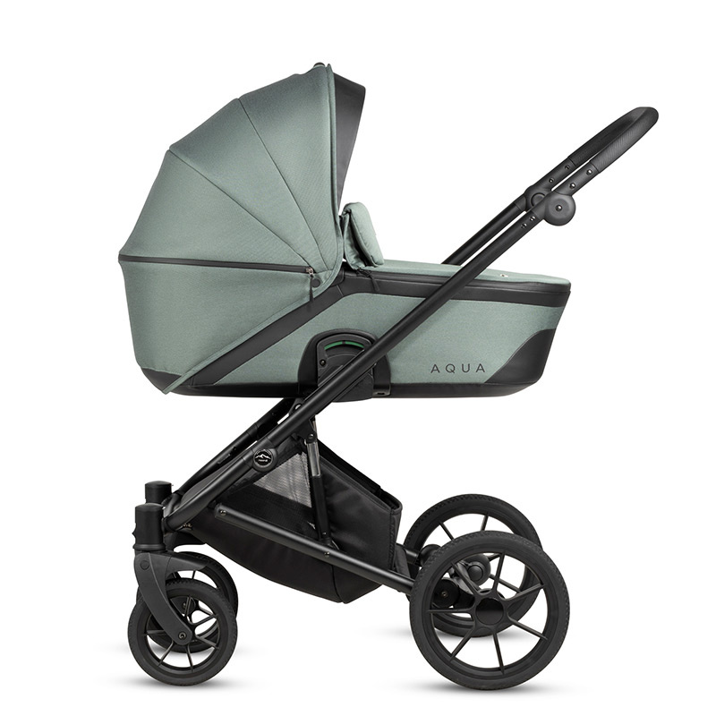 Wózek głęboko spacerowy Noordi Aqua V.2. Przeznaczony jest dla dzieci od urodzenia do maksymalnej wagi 22kg. Smukły stelaż jest łatwy w składaniu, zarówno z siedziskiem wpiętym przodem, jak i tyłem do kierunku jazdy. Średnia waga 9 kg pozwala na sprawne przenoszenia stelaża i jego transport. Podwójna amortyzacja Double Absorption System ułatwia prowadzenie wózka w trudnym terenie, minimalizuje nierówności i wibracje. Duże, bezobsługowe, piankowe koła o średnicy 8 i 12″ sprawdzą się idealnie na każdej powierzchni. Przednie koła są skrętne z możliwością zablokowania do jazdy na wprost. Centralny hamulec jest prosty w obsłudze i nie niszczy butów. Pojemny kosz pomieści niezbędne na spacerze akcesoria i zakupy. Łamana w 3 pozycjach rączka pozwala na dostosowanie jej wysokości do wzrostu rodzica.
