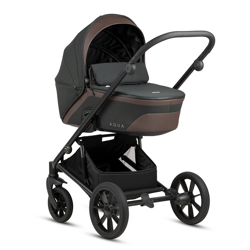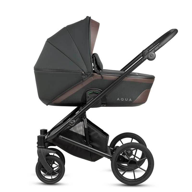 Wózek głęboko spacerowy Noordi Aqua V.2. Przeznaczony jest dla dzieci od urodzenia do maksymalnej wagi 22kg. Smukły stelaż jest łatwy w składaniu, zarówno z siedziskiem wpiętym przodem, jak i tyłem do kierunku jazdy. Średnia waga 9 kg pozwala na sprawne przenoszenia stelaża i jego transport. Podwójna amortyzacja Double Absorption System ułatwia prowadzenie wózka w trudnym terenie, minimalizuje nierówności i wibracje. Duże, bezobsługowe, piankowe koła o średnicy 8 i 12″ sprawdzą się idealnie na każdej powierzchni. Przednie koła są skrętne z możliwością zablokowania do jazdy na wprost. Centralny hamulec jest prosty w obsłudze i nie niszczy butów. Pojemny kosz pomieści niezbędne na spacerze akcesoria i zakupy. Łamana w 3 pozycjach rączka pozwala na dostosowanie jej wysokości do wzrostu rodzica.