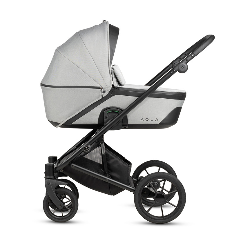 Wózek głęboko spacerowy Noordi Aqua V.2. Przeznaczony jest dla dzieci od urodzenia do maksymalnej wagi 22kg. Smukły stelaż jest łatwy w składaniu, zarówno z siedziskiem wpiętym przodem, jak i tyłem do kierunku jazdy. Średnia waga 9 kg pozwala na sprawne przenoszenia stelaża i jego transport. Podwójna amortyzacja Double Absorption System ułatwia prowadzenie wózka w trudnym terenie, minimalizuje nierówności i wibracje. Duże, bezobsługowe, piankowe koła o średnicy 8 i 12″ sprawdzą się idealnie na każdej powierzchni. Przednie koła są skrętne z możliwością zablokowania do jazdy na wprost. Centralny hamulec jest prosty w obsłudze i nie niszczy butów. Pojemny kosz pomieści niezbędne na spacerze akcesoria i zakupy. Łamana w 3 pozycjach rączka pozwala na dostosowanie jej wysokości do wzrostu rodzica.