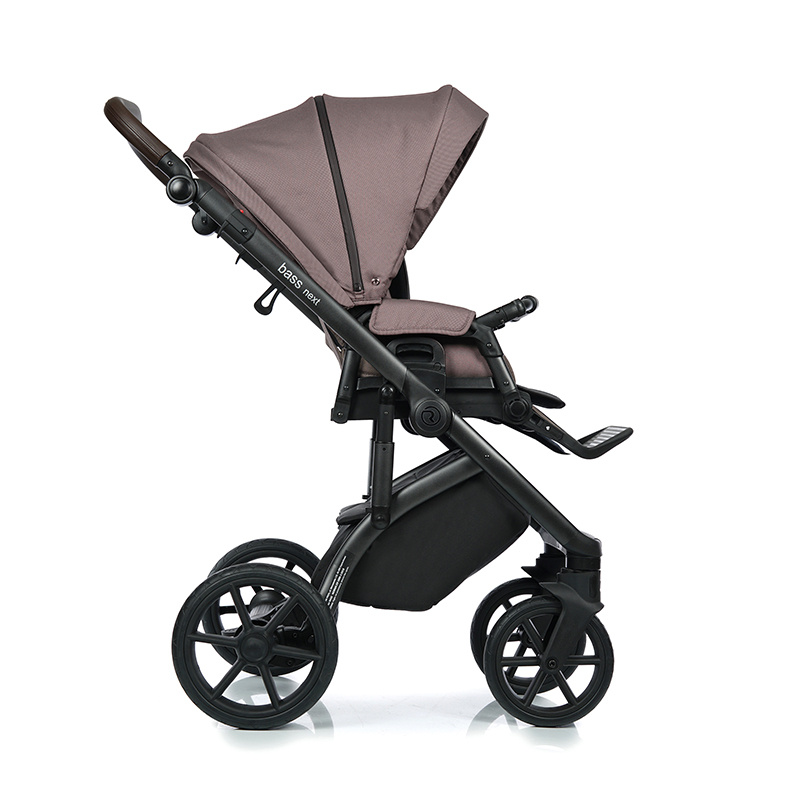 Roan Bass Next, wielofunkcyjny i wygodny wózek głęboko-spacerowy. Przeznaczony jest jest dla dzieci od urodzenia do maksymalnej wagi 22 kg. Stelaż wykonany z aluminium jest lekki i się składa do kompaktowych rozmiarów. Składanie jest szybkie i łatwe i odbywa się jednym płynnym ruchem, wystarczy odciągnąć dwa przyciski umieszczone na stelażu. Roan Bass Next wyposażony jest w duże bezdętkowe, bezobsługowe koła, odporne na przebicie i ścieranie, które prowadzą się doskonale na każdym terenie. Przednie koła są skrętne, ułatwiając manewrowanie z możliwością zablokowania do jazdy na wprost. Dodatkowo posiadają system stabilizacji Anti Shock, co znacznie zwiększa łatwość prowadzenia. Regulowana amortyzacja zapewni dziecku komfort podczas spaceru na każdym terenie. Jest to podwójny system SAS , na kołach wózka oraz na ramie, który można jeszcze dodatkowy regulować i blokować. Hamulec umieszczony na tylne osi działa na zasadzie kliknięcia i nie niszczy obuwia. Pojemny, zamykany kosz w dolnej części stelaża pomieści wszystkie niezbędne akcesoria i zakupy. Rączka pokryta ekoskórą jest regulowana.