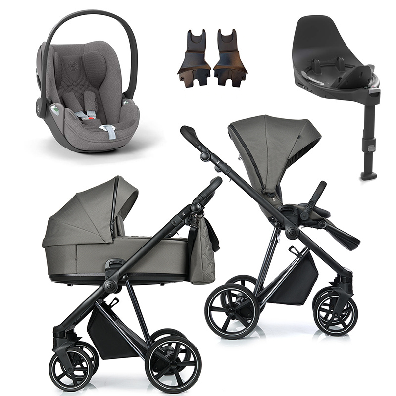 Funkcjonalny zestaw 4 w 1, wózek Roan IVI 2.0 z fotelikiem Cybex Cloud T i-Size Plus, bazą Cybex Base T i adapterami umożliwiającymi wpięcie fotelika na stelaż.