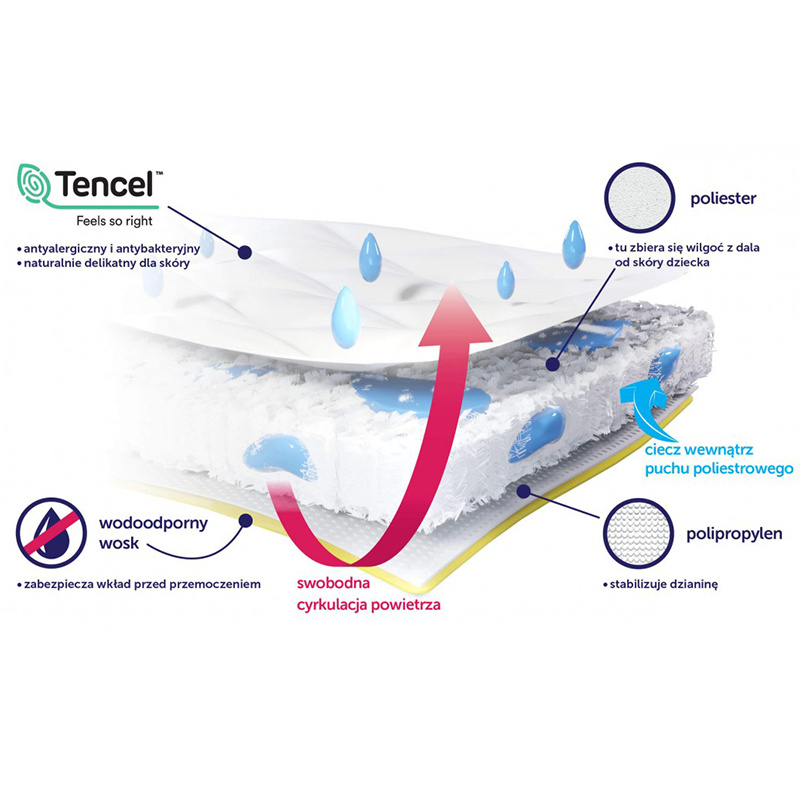 • wierzchnia część to Tencel - ekskluzywna, naturalna dzianina, która doskonale zarządza wilgocią - kilka razy lepiej niż bawełna, pochłania i oddaje do otoczenia aż o 50% więcej pary wodnej niż bawełna, materiał Tencel jest niezwykle miły i delikatny w dotyku. Unikalne właściwości włókna sprawiają, że w zimne noce zapewnia ciepło, a latem przyjemnie chłodzi.