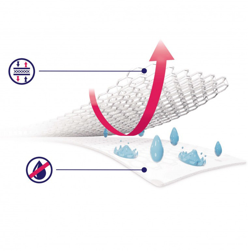 • druga warstwa (dolna) - wodoodporny laminat, wilgoć przechodząc przez prześcieradło i siateczkę 3D zatrzyma się właśnie na tej warstwie ochraniacza, a skóra dziecka nie odczuje dyskomfortu.