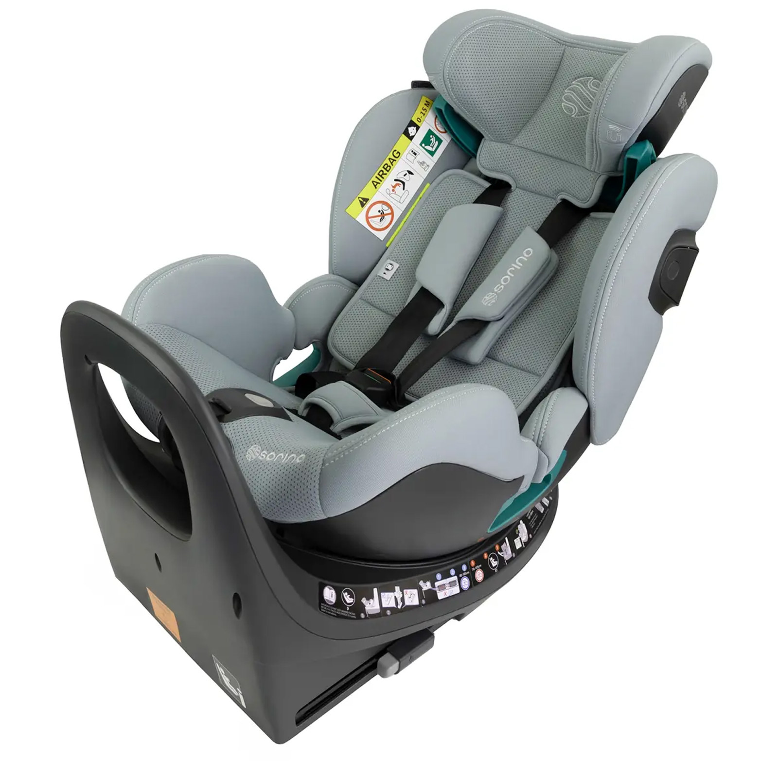 - Fotelik samochodowy Sorino Aurora 40–150 cm zgodny z normą i-Size, z bazą obrotową 360°, montażem ISOFIX, 3 pozycjami pochylenia w obu kierunkach jazdy oraz zagłówkiem z automatycznie rozszerzającymi się bokami.