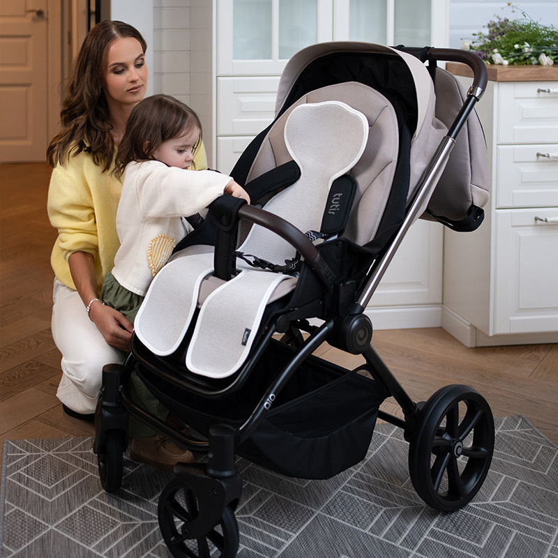 Siedzisko spacerowe w wózku Tutis Gio jest komfortowe i pojemne. Można je zamontować zarówno przodem, jak i tyłem do kierunku jazdy. Miękka wkładka daje dziecku wygodę i jest przytulna. Oparcie jest regulowane w 3 zakresach, do pozycji leżącej. W połączeniu z regulowanym zagłówkiem zapewnia dziecku dużą i przestronną przestrzeń do odpoczynku. Obszerna budka z daszkiem przeciwsłonecznym ma możliwość powiększenia i dodatkowy panel. Na szczycie budki znajduje się siateczkowe okienko do podglądu dziecka w trakcie jazdy. Służy ono również jako wentylacja w ciepłe dni. Siedzisko wózka Tutis Gio wyposażone jest w 5-punktowe pasy z miękkimi nakładkami i możliwością regulowania ich wysokości. Magnetyczna klamra ułatwia i przyspiesza zapinanie uprzęży. W zestawie z wózkiem znajduje się wypinany obustronnie pałąk oraz osłonka na nóżki.