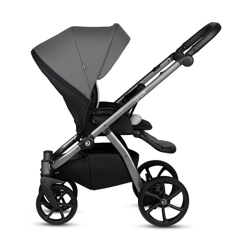 Wózek głęboko spacerowy Tutis Uno 5+, funkcjonalne rozwiązanie na każdy teren. Stelaż zbudowany jest z lekkiego aluminium, dzięki czemu razem z kołami waży jedynie 7,25kg. Składa się na płasko do małych rozmiarów, w wersji spacerowej z siedziskiem skierowanym zarówno tyłem, jak i przodem. Koła z technologią Tutis All-Road są odporne na przebicia i specjalnie wyprofilowane. Znajdą swoje zastosowanie w każdym terenie, czy to miejskim, czy leśnych ścieżkach. System hamulcowy typu One Click jest prosty i nie niszczy butów. Rączka pokryta ekoskórą jest regulowana i dostosuje się do wzrostu rodzica. Przestronny kosz na zakupy znajduje się w dolnej części stelaża.